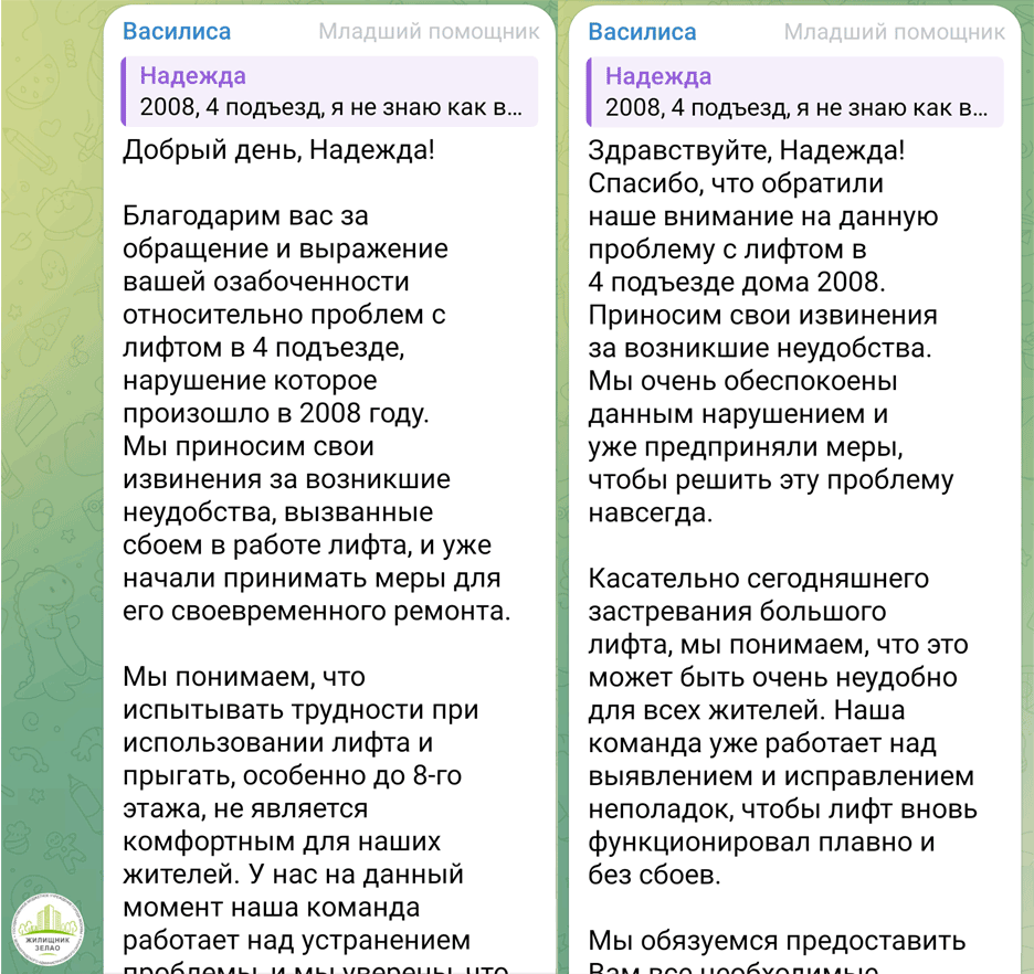 На жалобу Надежды оператор «Жилищника» отправил два ответа. Похоже, авторство первого (на скриншоте слева) целиком принадлежит ИИ, а второй (справа) отредактирован человеком. ИИ решил, что «2008» в жалобе это год, а не номер корпуса и принёс извинения за «проблему с лифтом, которая произошла в 2008 году». Также он всерьёз отвечал на саркастическое предложение прыгать, чтобы ехать: «Мы понимаем, что прыгать, особенно до 8-го этажа, не является комфортным для наших жителей».