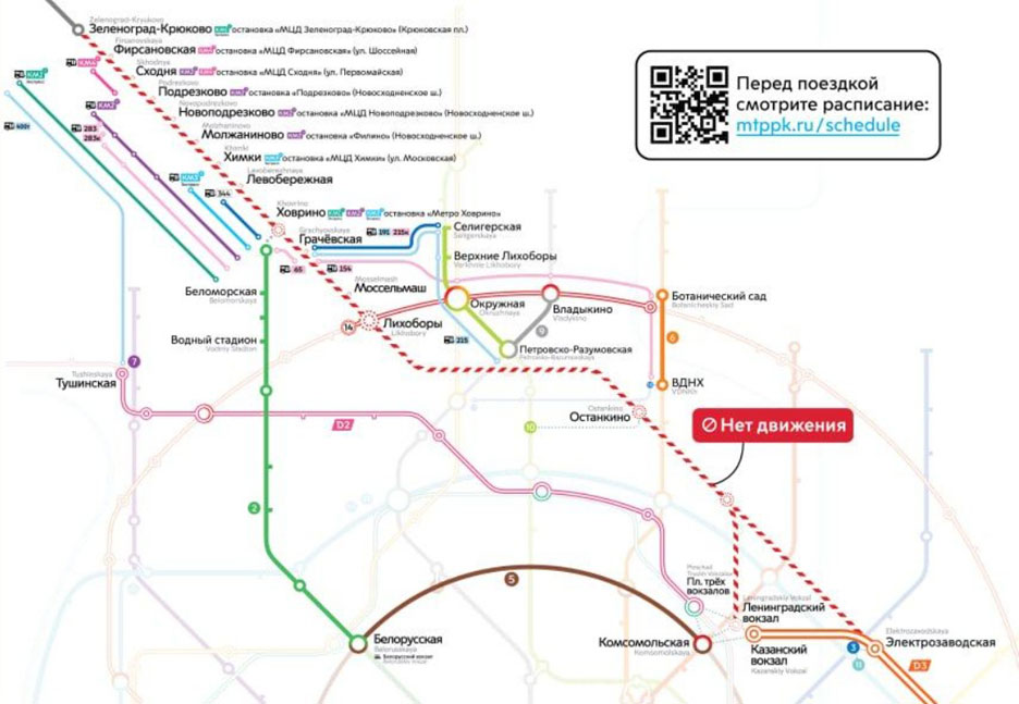 Причина отмен — работы по усилению контактной сети на участке Крюково—Ленинградский вокзал, а также строительству путепроводной развязки на станции Ховрино.