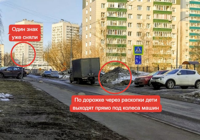 Знаки перехода хоть немного, но сдерживали водителей, которые, с одной стороны, не могут разъехаться, а с другой — гоняют по дороге как хотят в отсутствие контроля. Пешеходов поставили в жёсткие условия. Некогда спокойный местный проезд превратился из-за стройки в фактически однополосную дорогу, а количество машин увеличилось в разы. Автомобили и грузовики ездят по тротуару. Переходить дорогу сложно, потому что, во-первых, часть проезда перекрыта строительным забором и переходить просто некуда. Во-вторых, в часы пик плотный поток машин и не даёт это сделать. И такая ситуация будет ещё не меньше двух лет.
