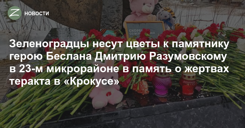 Цветы, игрушки, свечи, иконы проносили зеленоградцы к памятника Дмитрия Разумовского в 23-м микрорайоне в память погибших в теракте в «Крокусе».