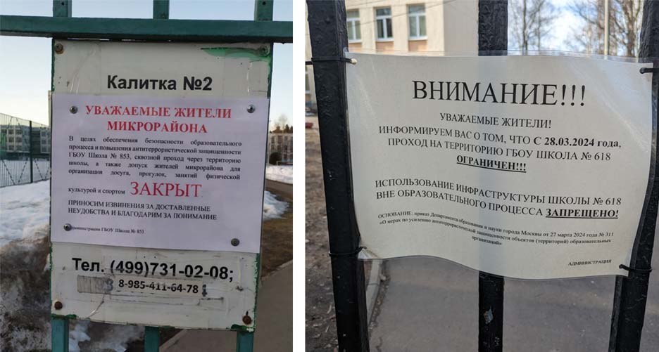 Объявления об закрытии прохода появились на калитках школ. Например, школа 853 сообщила о закрытии сквозного прохода и допуска жителей микрорайона «для организации досуга, прогулок и занятий физкультурой и спортом». Школа 618 сообщила, что «проход ограничен, использование инфраструктуры школы вне образовательного процесса запрещено». В некоторых других школах объявлений нет, но проход закрыт.