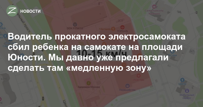 Это далеко не первое ДТП с электросамокатами на площади Юности. Ещё в прошлом году, после похожего ДТП, мы предлагали сделать площадь так называемой «медленной зоной» с автоматическим ограничением скорости в 10-15 км/ч (схема на рисунке ниже). Это предложение тогда поддержало 92% читателей «Зеленоград.ру», а в опросе приняло участие две тысячи человек.