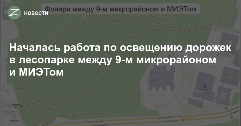 В лесу между 9-м микрорайоном и МИЭТом, на разных дорожках (135 фонарей, 3275 метров новых линий освещения)