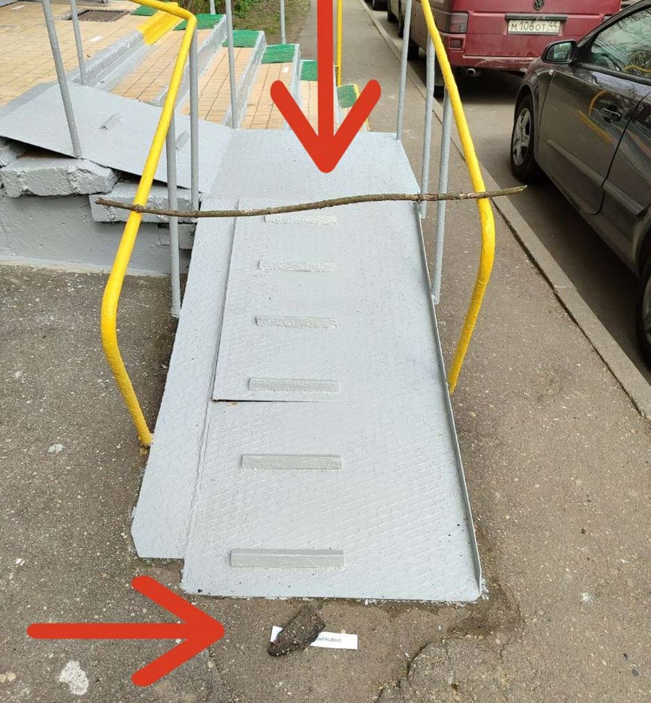Палка лежит на перилах второго подъезда корпуса 1455, как бы перегораживая проход (но только с одной стороны), а камень придерживает лежащую на земле бумажку «Осторожно, окрашено».