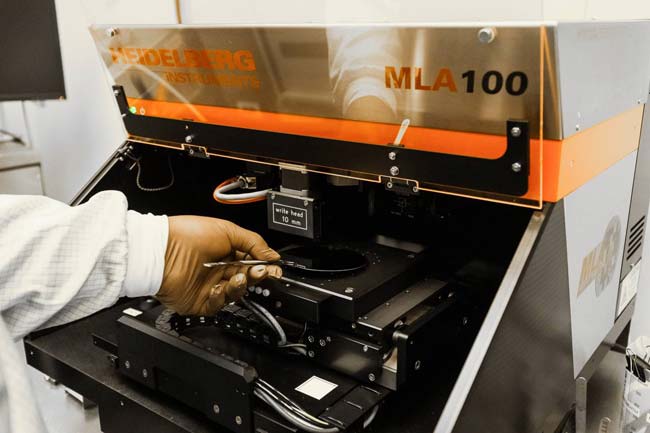 Работу проделали специалисты МФТИ, она проходила в чистой зоне, чтобы на схему не попали пылинки. В центрифуге на пластину нанесли фотополимер, а схему отобразили ультрафиолетом. Затем пластину поместили в щелочной раствор, который частично разъел слой, оставив только начертания схемы. Потом пластину поместили в вакуумную камеру, в которой с помощью электрического импульса вскипятили золото до 2800 градусов — золотой пар осел на схему и на пластине появились линии и названия станций. Далее при помощи горячего растворителя удалили оставшийся полимер, сохраняя только золотые линии метро.