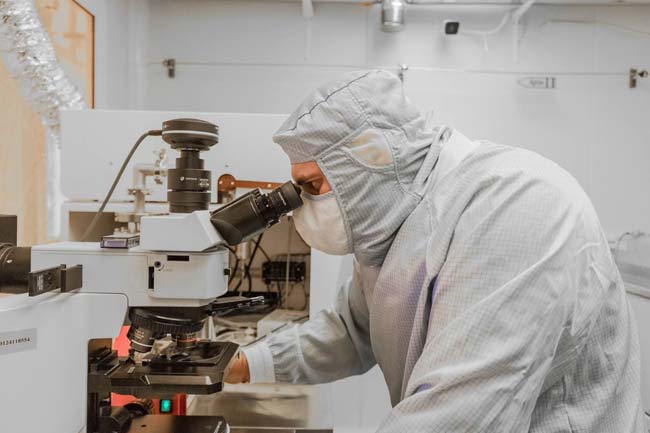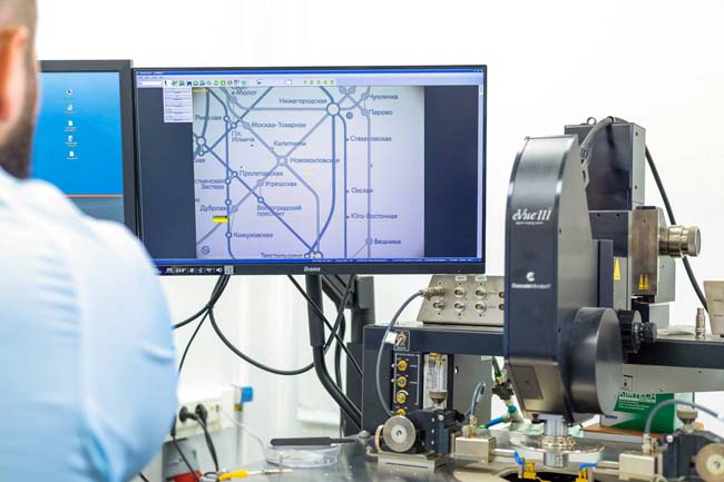 430 станций (включая МЦД) уместили на пластине монокристаллического кремния размером 2 квадратных сантиметра. Линии метро на маленькой схеме почти в два раза тоньше человеческого волоса — 65 микрон.