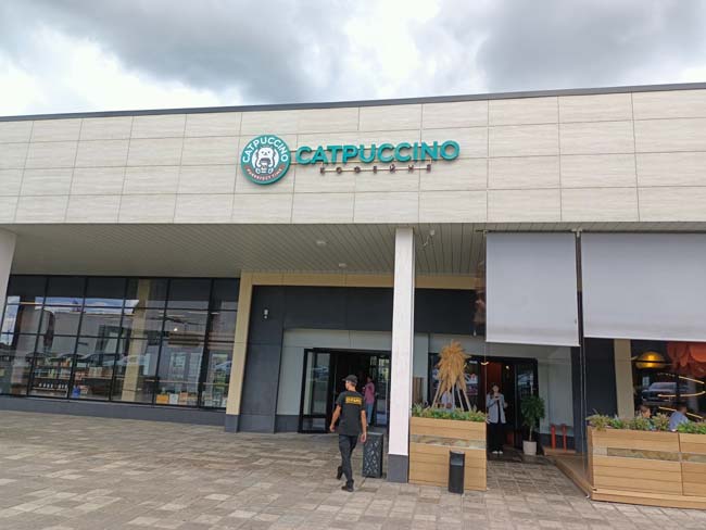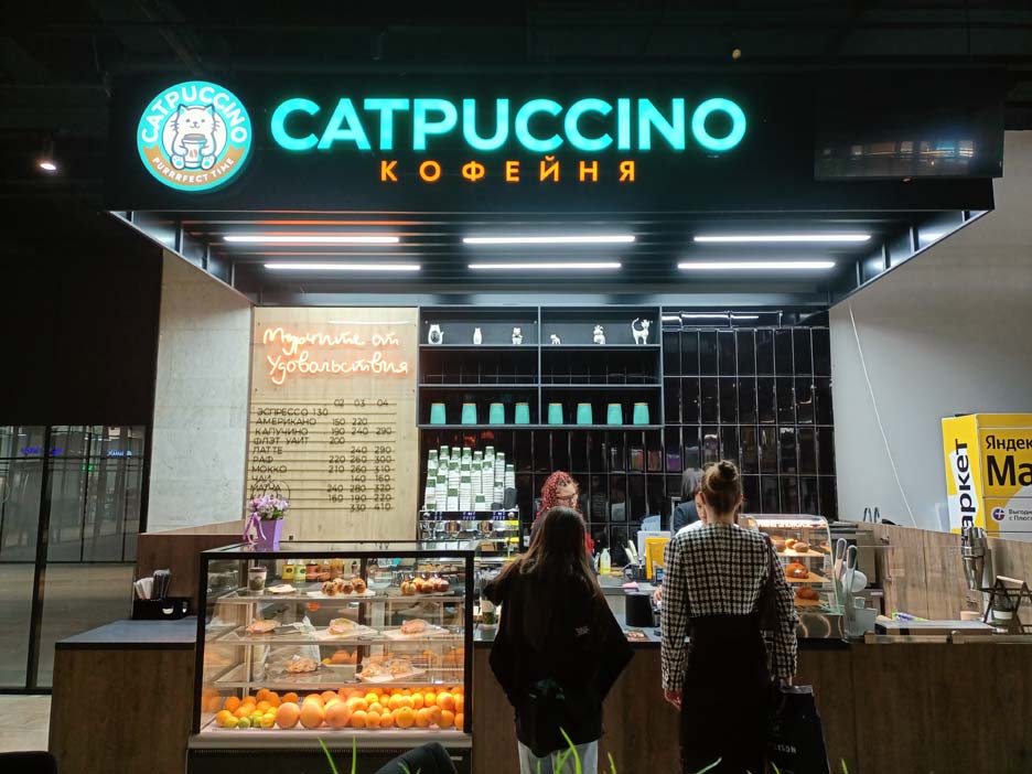Расположен «Котпучино» в ТЦ в Савелкинском проезд, вход рядом с рестораном Arvo — узнаете их по логотипу «как бы Старбакс». Внутри, кроме прилавка, несколько столиков на троих. Работают с 9 до 22.