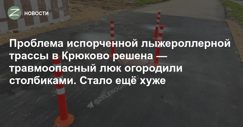 Три года назад, когда эта спортивная трасса открывалась, выяснилось, что на ней свободно могут ходить пешеходы, выгуливать собак и детей, а щебень, которым была отсыпана трасса по краям, регулярно оказывался на асфальте и мог попасть под колеса спортсменам. Уже тогда они говорили, что можно сразу строить рядом травмпункт. А теперь понятно, какое место для него выбрать — прямо рядом с этим люком и столбиками. В зеленоградском чате горько шутят, что лучше было бы установить здесь лежачего полицейского а между столбиками поставить отбойник.