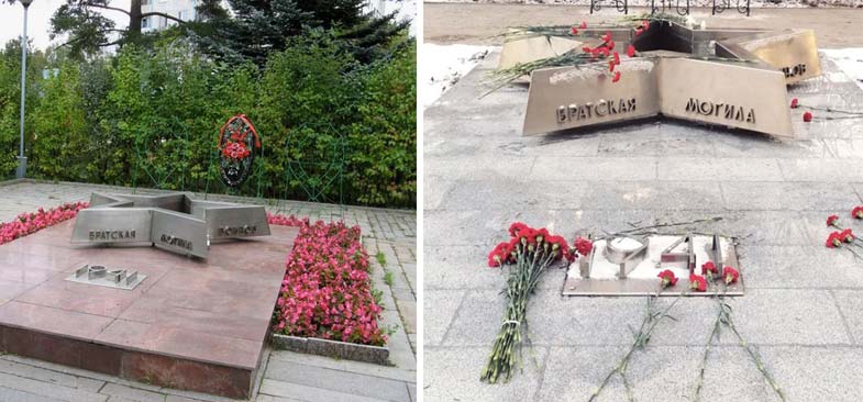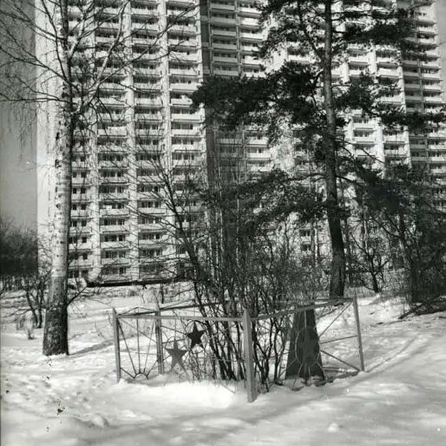 На старой фотографии — каким было это место в конце 1970-х. «Братская могила в 10-м микрорайоне, в районе улицы Колхозная», так он помечен на сайте ретро-фотографий Pastvu. Первые башни поблизости только что построили, а Колхозной называлась изогнутая улица, которая и сейчас идет мимо памятника через весь микрорайон к Школьному озеру — тогда на его берегу под соснами тоже располагались частные дома.
