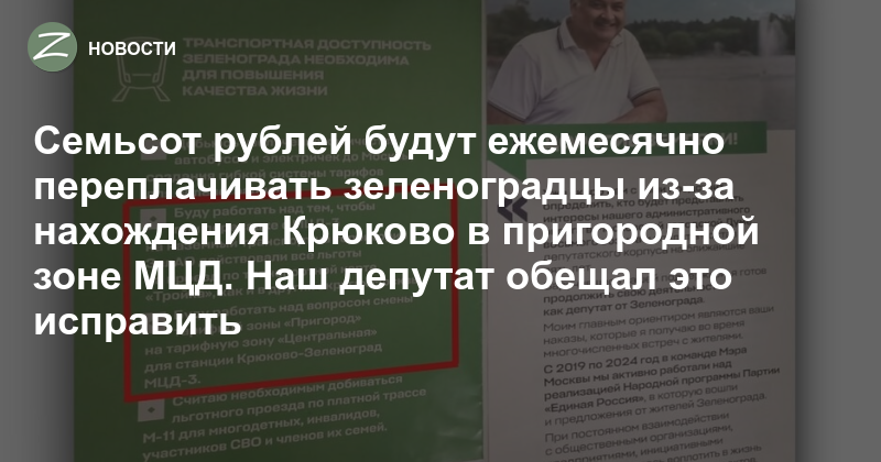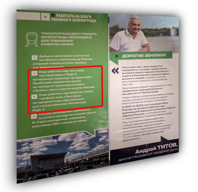 Эту очевидную несправедливость обещал исправить зеленоградский депутат в Мосгордуме от партии «Единая Россия» Андрей Титов. «Транспортная доступность Зеленограда необходима для повышения качества жизни», — говорил он во время избирательной кампании и обещал «работать на благо любимого Зеленограда». Решение проблемы с нахождением Зеленограда в пригородной зоне МЦД была его ключевым пунктом его программы действий.