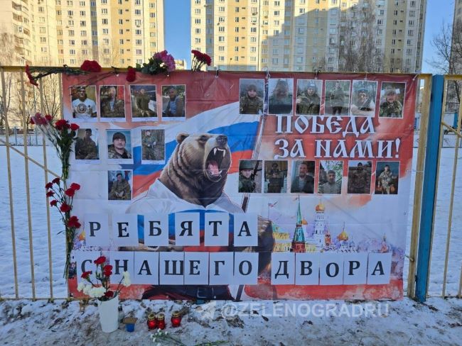 Плакат с фотографиями участников СВО из 14-го микрорайона сделали их друзья и повесили на заборе футбольного поля во дворе корпусов 1448—1451 накануне 23 февраля. К нему приносили цветы и свечи.