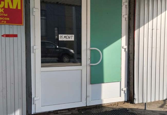 Следы от пожара видны на фасаде здания. Испорченные прилавки уже вынесли на улицу. Сейчас открыта часть рынка со стороны улицы Панфилова, в остальных помещениях идёт ремонт.