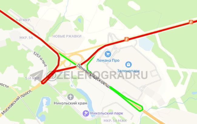 Сейчас при движении по Ленинградскому шоссе в сторону Москвы на платную дорогу М-11 навигатор строит маршрут через Зеленоград — с разворотом на Московском проспекте (на схеме отмечено красным). Для легковых машин это нормально, но грузовики просто не могут нормально развернуться. Результат — заторы и вечно испорченный газон и бордюр на развороте напротив ТЦ в 5-м микрорайоне. При этом нормальный разворот для грузовиков есть на Ленинградке чуть дальше — напротив МЖК, ехать дополнительно всего 600 метров (на схеме — зеленым).
