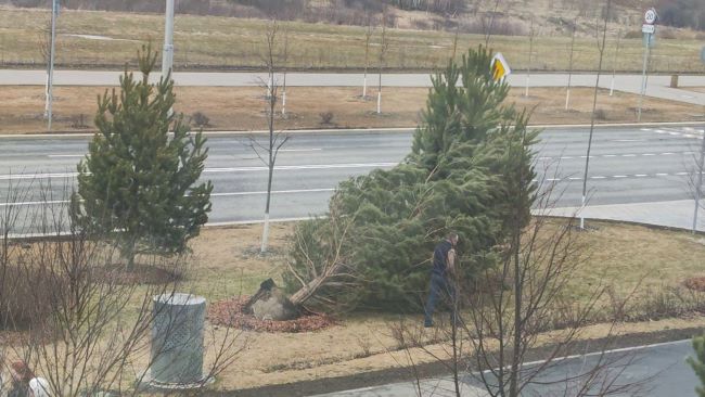 Недавно посаженное дерево повалило на площадке ОЭЗ «Алабушево». Очевидно, дерево ещё не успело укорениться (хотя, похоже, корни при посадке даже не освободили), но ствол никак не закреплен, что обязательно нужно делать.