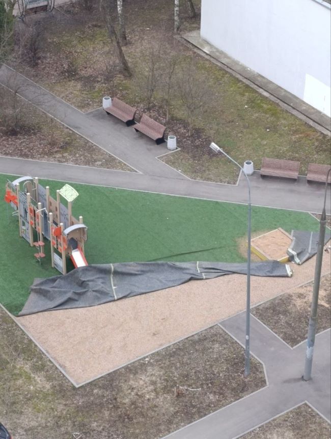 Ветер сорвал покрытие детской площади из искусственной травы, которое, вероятно, было закреплено так, что под него могло задувать.