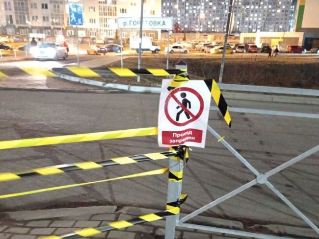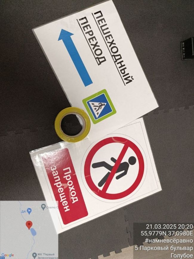 Самодельную ограду из желтой сигнальной ленты и указателя на пешеходный переход на перекрестке Трёхсвятской улицы и Паркового бульвара в Голубом сделал местный житель Ринат.