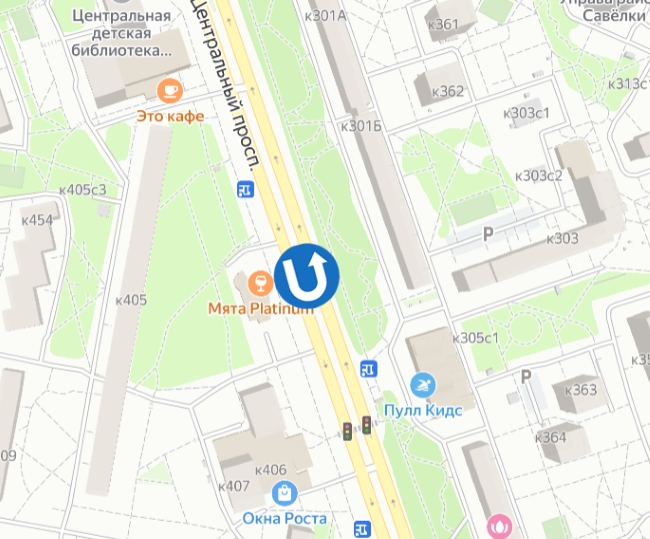 - Разворот на Центральном проспекте у «Темпл бара» сделают разворот в сторону площади Юности. Здесь уже есть разделительная полоса в разметке, за счёт неё и небольшого сужения других полос и сделают разворот.