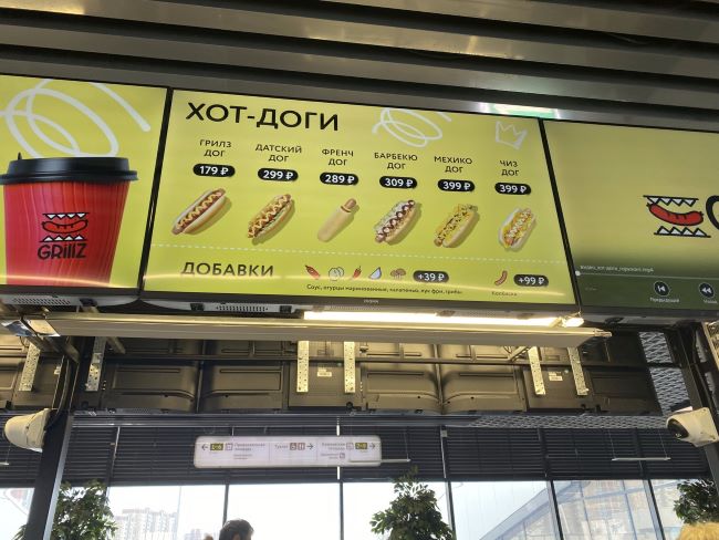 Это третья точка сети One and Double на вокзале. Главное блюдо в меню — хот-доги от 179 до 399 рублей. К ним можно добавить соус, маринованные огурцы, халапеньо, лук фри, грибы за 39 рублей. Дополнительная колбаска обойдётся в 99 рублей.