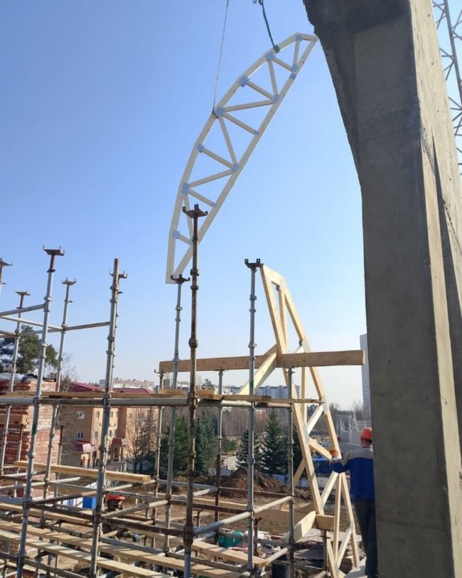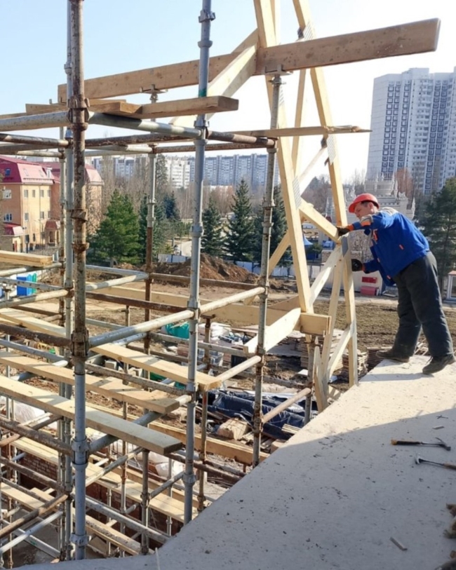 С начала года на стройке выполняются монолитные работы — возводят стены, перекрытия, лестницы, а также кирпично-армированную кладку стен колокольни и входной группы. В конце апреля планируют начать кладку стен звонницы.