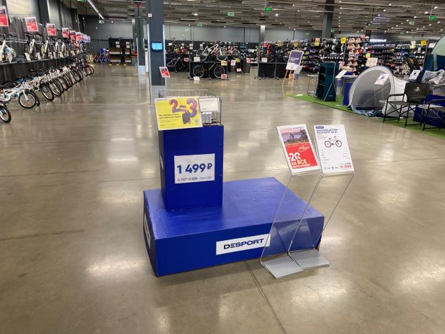 Пока в Desport действует скидка 20% на велосипеды, самокаты, ролики и скейты. Также представлены товары по акции «2=3» и спортивный инвентарь с табличкой «лучшая цена». Сейчас продавцы занимаются обновлением ценников. В ближайшие дни в спортивном гипермаркете будут скидки, но лишь на некоторые товары.