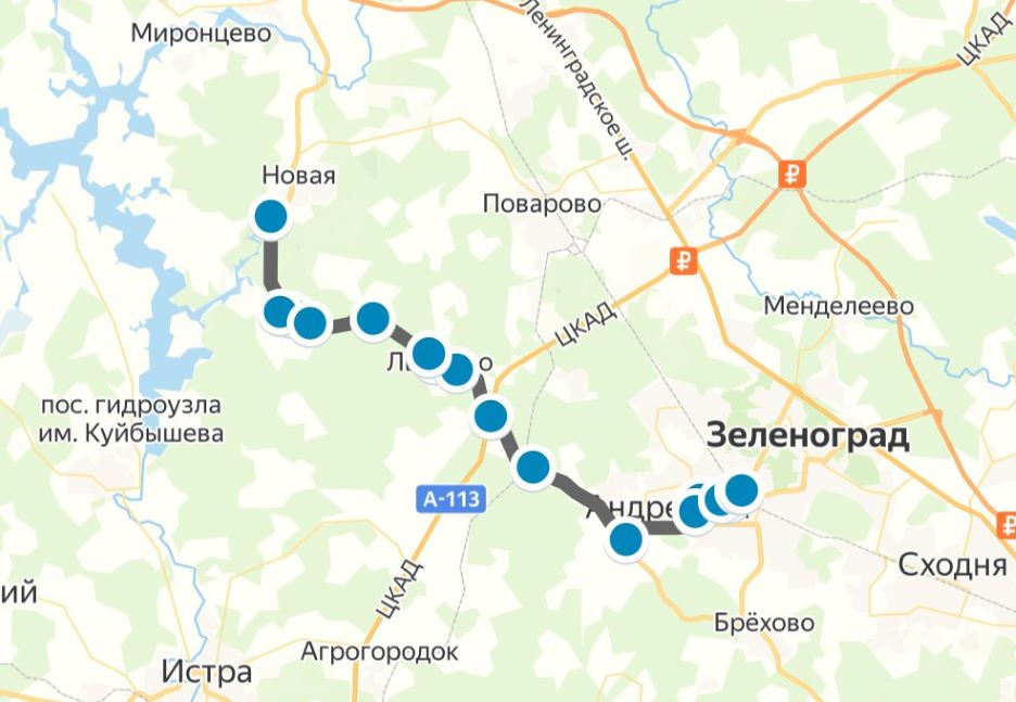 По Зеленограду маршруты делают остановки «Крюковская эстакада», «Районный суд», «Стоматологическая поликлиника», «Рынок», «Михайловский пруд», «15-й микрорайон», «Корпус 1602» и «16-й микрорайон».