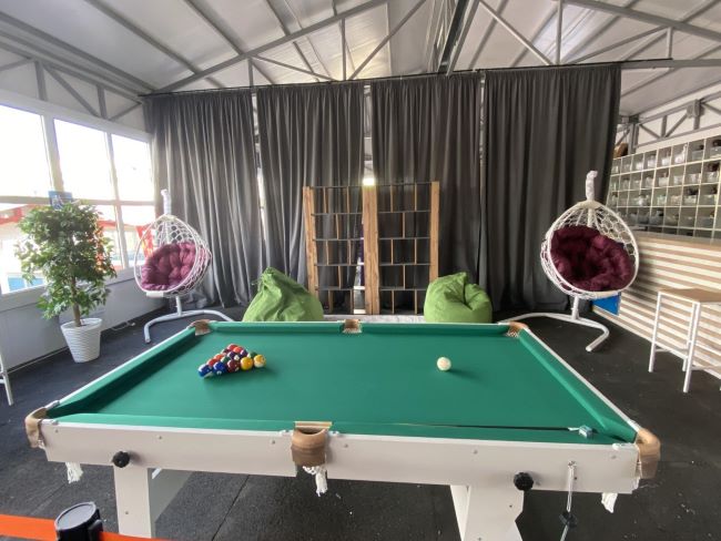 Здесь уже поставили мягкие пуфики, подвесные кресла, диванчик, а также бильярд. Скоро планируют открыть тир и кафе от небольшой местной сети Qixi — с акцентом на бабл-чай.