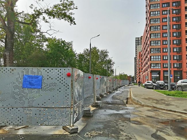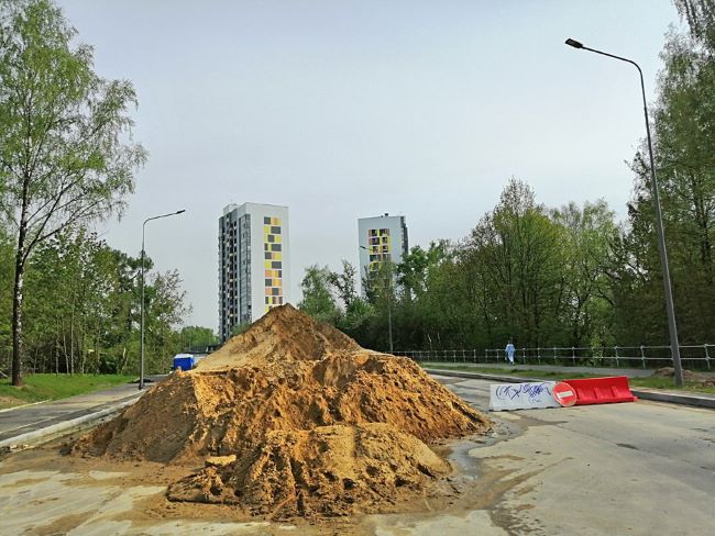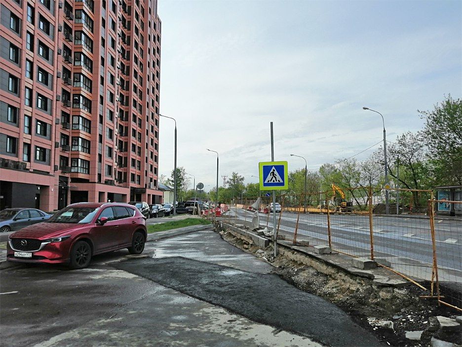 Дальше, на изгибе дублёра к корпусу 1936, ещё идёт стройка: лежат стройматериалы, стоит техника и бытовки рабочих. Дорога становится совсем непроезжей. Но один из тротуаров открыт — по нему можно пройти весь путь до улицы Радио. Этим пользуются пешеходы и велосипедисты.