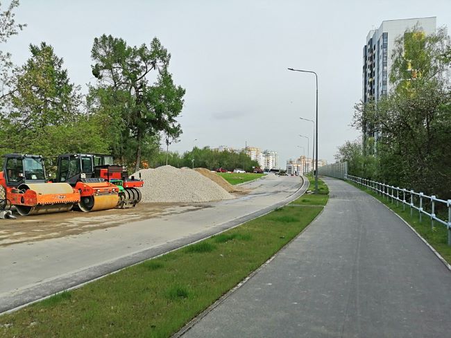 Участок после поворота с Заводской улицы выглядит практически готовым: широкие тротуары, гладкий асфальт, новые газоны, автобусные остановки, светофоры. Вдоль новостройки, дома 14 по Заводской, уже заезжают автомобили. Но дальше проезд только для строительной техники.