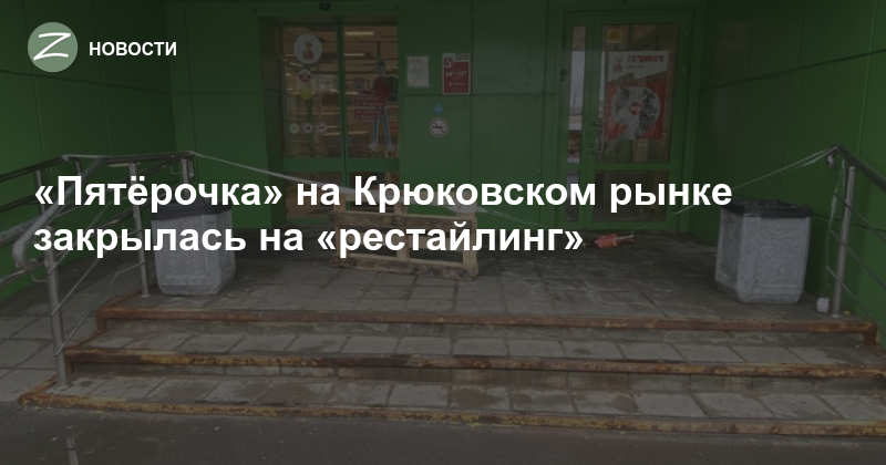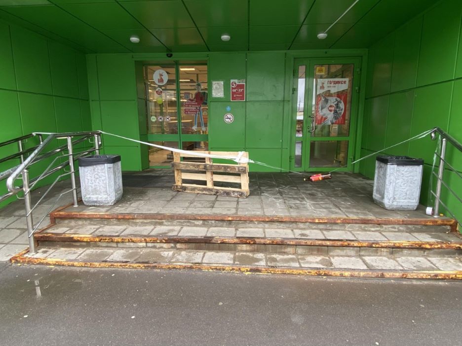 Вход в «Пятёрочку» на Панфилова 30 огражден изолентой, бутылками и деревянной дощечкой. Двери закрыты, на стекле информация: «С 16 мая магазин закрывается на рестайлинг».