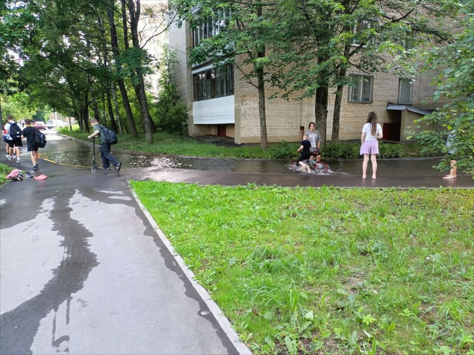Проезд вокруг корпуса 510 залило водой. Что случилось, пока непонятно. Но местным детям всё равно — для них этот участок дороги превратился в импровизированный бассейн.