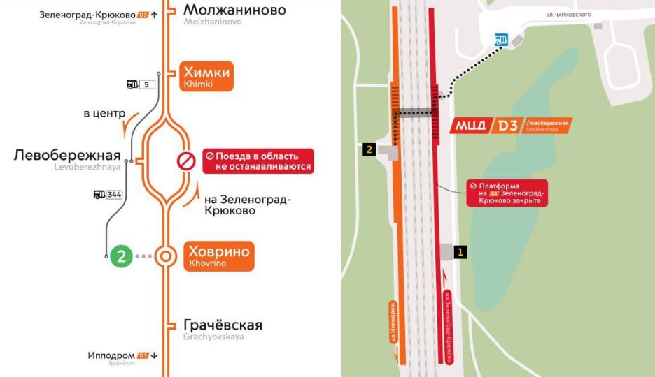 - чтобы отправиться с Левобережной в направлении Крюково проезжайте до Ховрино и — переходите на платформу к поездам в направлении Крюково