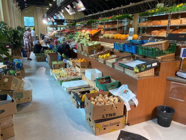 В здании на Яблоневой аллее работают только три павильона, и все принадлежат одному владельцу. В ассортименте: овощи, фрукты, ягоды, орехи, сухофрукты, чаи. Цены выше, чем на Крюковском рынке: томаты — от 200 рублей за кг, огурцы — от 100, черешня — 650, клубника — 750, голубика — 800.