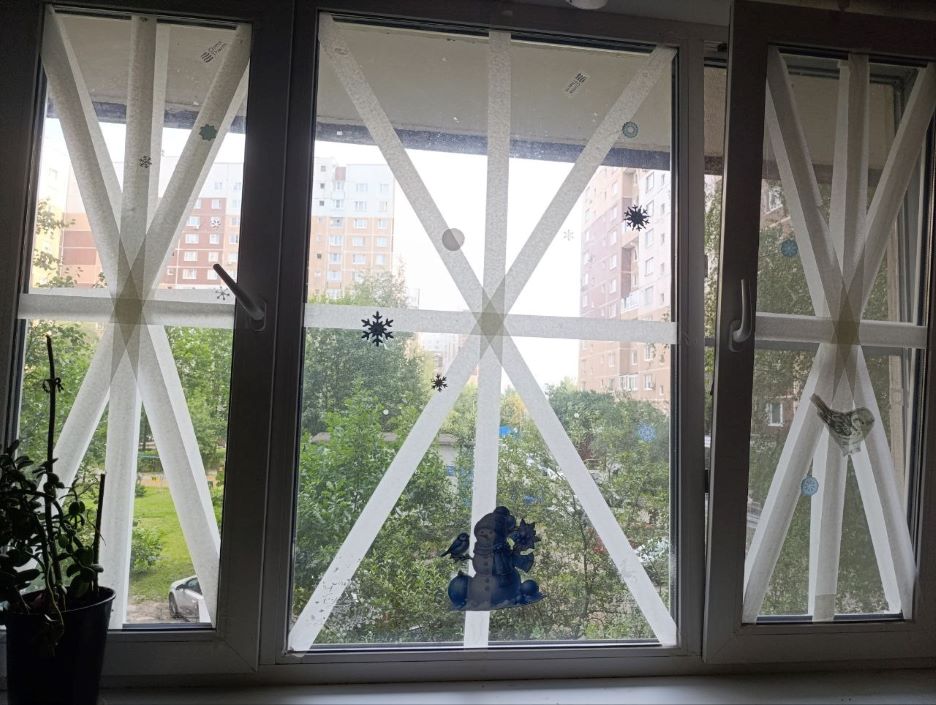 Поможет ли скотч крест-накрест: некоторые жители Зеленограда уже наклеила на окна кресты из скотча (на фото). Это лучше, чем ничего, но всё же: мнение «наклею крест?накрест скотч — и порядок» — распространенное заблуждение. Скотч удержит лишь крупные осколки, но не предотвратит разлет мелких и не удержит стекло в раме.
