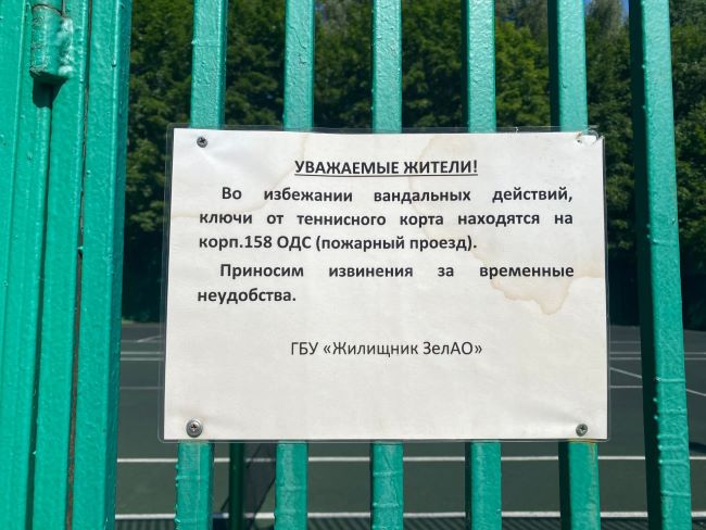 На входе на корт за домом 3 на площади Юности табличка: «Во избежание вандальных действий ключи находятся в корпусе 158 ОДС». Идти до туда не близко — пешком около 20 минут, а потом ещё обратно.