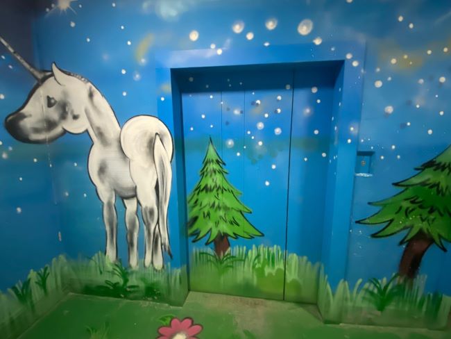 Ещё одно граффити с историей на 13-м этаже корпуса 2016. Здесь расписано все пространство: пол, стены, потолок, лифт, двери. Признания «Я всегда рядом», «Любовь — безмерно бесконечна! Я полюбил тебя навечно!» в космической тематике — их оставил в качестве подарка возлюбленный для своей девушки.