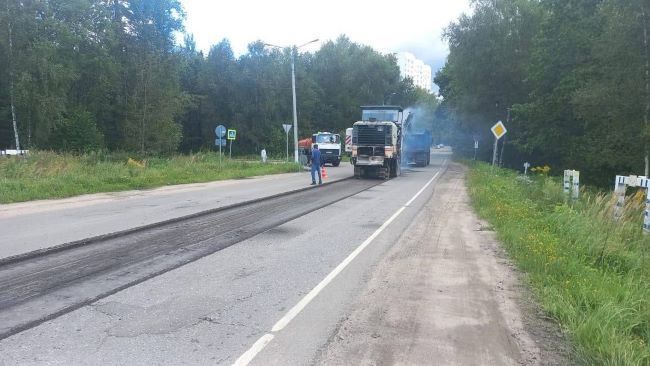 На двухкилометровой дороге в поселке напротив Зеленограда обновляют покрытие, укрепляют обочины и наносят разметку.