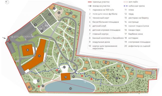 На территории будут: зиплайн, панда-парк, детский досуговый центр, теннисный корт, баскетбольная и мини-футбольная площадка, пруд в 6 тысяч кв.м с лодочной станцией и рестораном, а зимой с катком и снежными горками, аллеи для ходьбы и катания на велосипедах, барбекю-зона, коттеджи, парковка на сто машин. В парке планируют высадить ценные и декоративные породы деревьев.