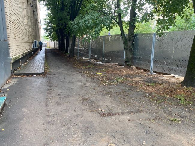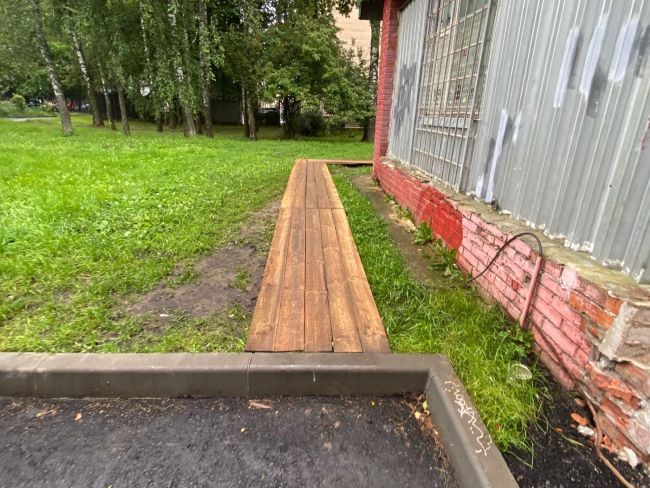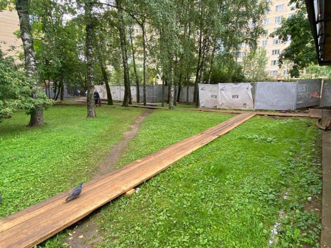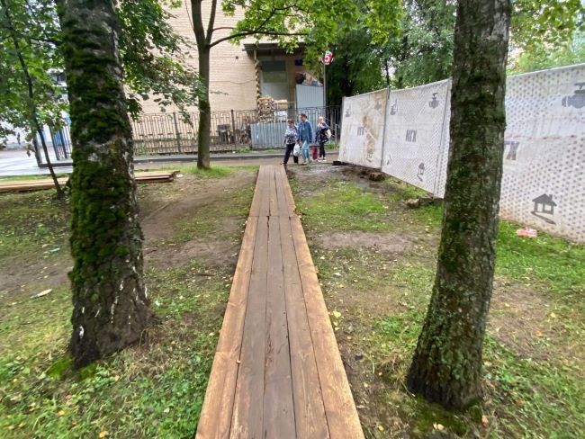 Деревянные настилы проложены через сквер, местами придётся пройти и по земле. В дождливую погоду тут грязно и сыро. Поэтому комфортнее перейти аллею еще у Центрального проспекта и двигаться по тротуару с другой стороны, который ремонтом не затронут.