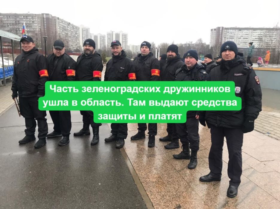 В Зеленограде было всего 25 народных дружинников, сейчас осталось меньше половины. По закону им положены индивидуальные средства защиты, материальная помощь, форма, транспорт, но, по их словам, ничего не дают — только льготный проездной на автобус. А в Солнечногорске дают.