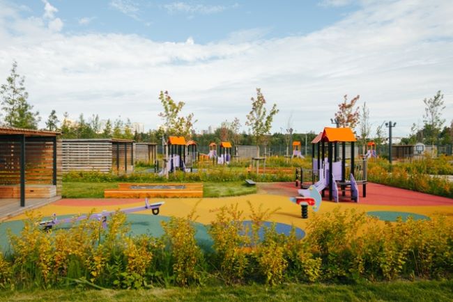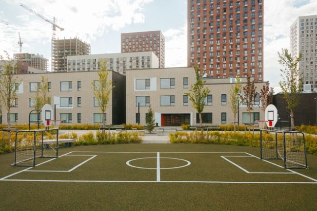 В трёхэтажном здании — входы на уровне земли, большие окна, просторные атриумы, спокойная нейтральная отделка. На улице не только обычные навесы, но и элементы для развития, экспериментов и активных игр.