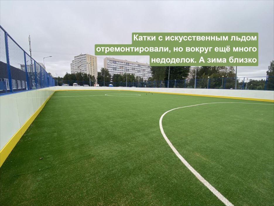 Все три катка до холодов планировали использовать как футбольные поля, но ворот нигде нет. Кроме того, на всех объектах до зимы нужно довести до ума постройки и окружающую территорию. А зима близко.