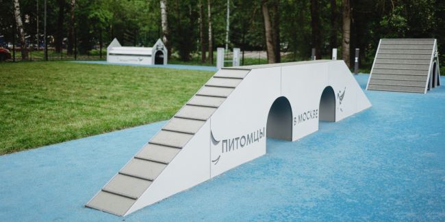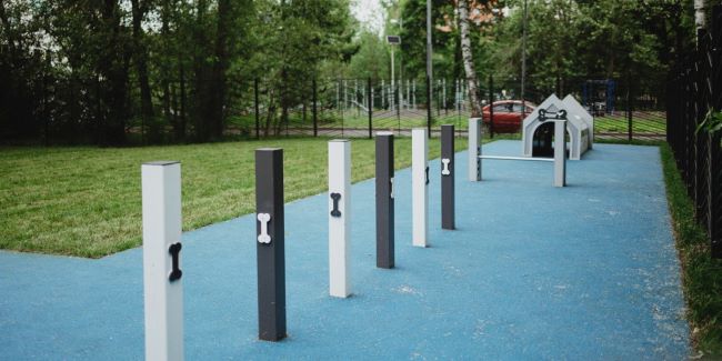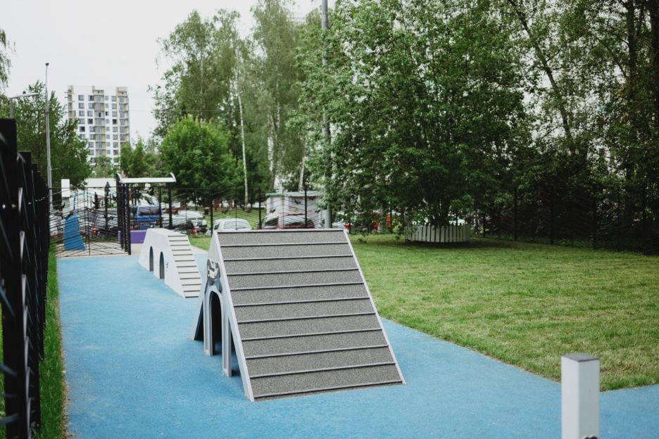 В тренировочной зоне установили разнообразные снаряды. Здесь есть «Бум» для повышения выносливости, барьер-перекладина, тоннель, слалом и наклонная стенка для развития координации движений питомца. В зоне отдыха для хозяев — скамья с навесом, специальные контейнеры для уборки за животными.
