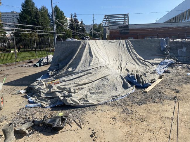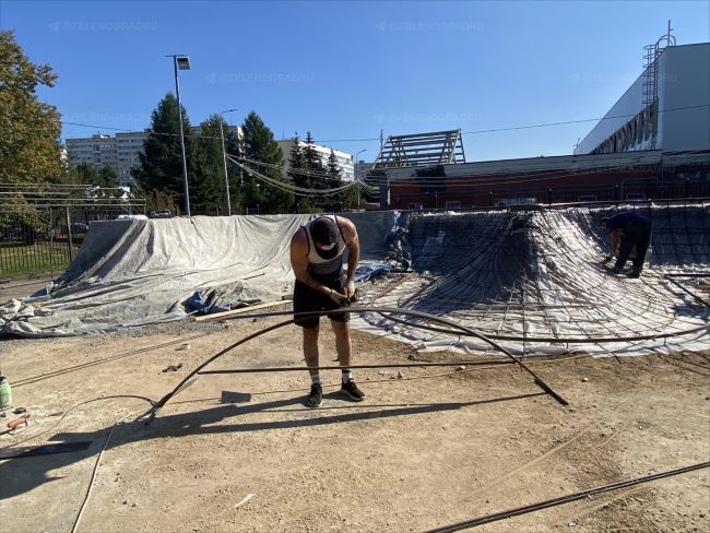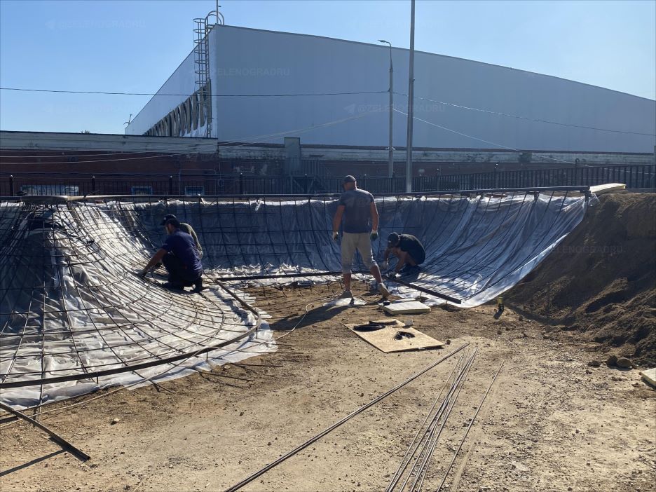 Первые слои бетона уже уложили, зашлифовали и закрыли плёнкой, чтобы избежать растрескивания. После этого бетон покроют защитным слоем «мастерпола» — специального состава, устойчивого к влаге и перепадам температур. После этого начнётся армирование конструкций и формирование фигур скейт-площадки.