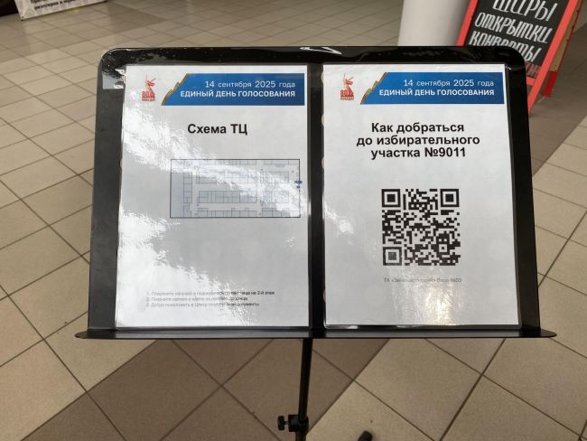 На входе в ТЦ установлена схема прохода на участок, дежурят два сотрудника охраны, нужно пройти через рамку, а также предоставить на проверку личные вещи. На втором этаже торгового центра расположился участок для голосования с электронными терминалами, членами избирательных комиссий и наблюдателями.