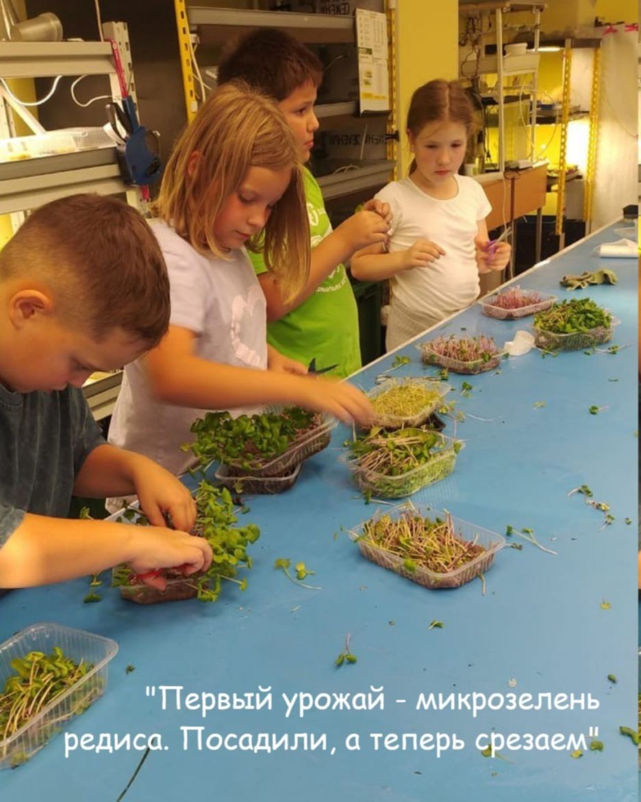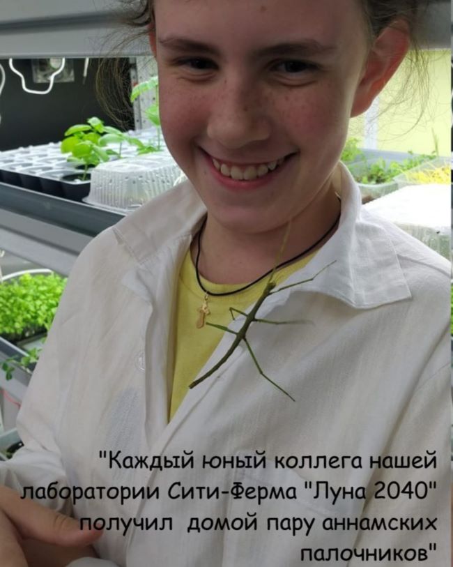 Микрозелень посадили на первых занятиях лаборатории в сентябре — и сейчас уже собрали урожай. А недавно каждый юный коллега получил домой пару аннамских палочников.