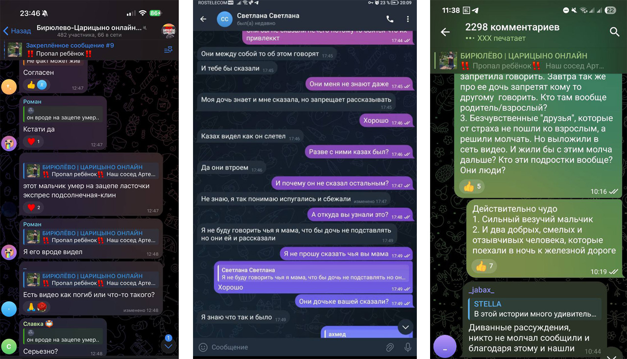 Этих трёх суток могло бы не быть, если бы «друзья» подростка сразу рассказали о случившемся взрослым. Но они, судя по чатам, рассказали своим ровесникам «по секрету». Более того, в районном чате появлялись какие-то мутные сообщения от мам, которые знали об этом страшном происшествии, но дети запретили об этом говорить.