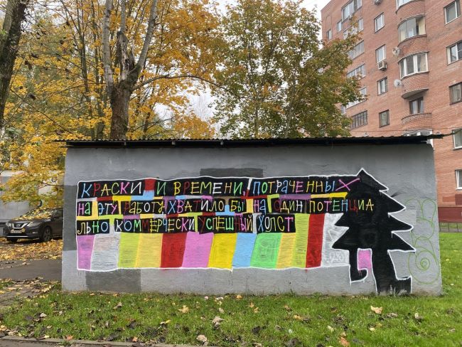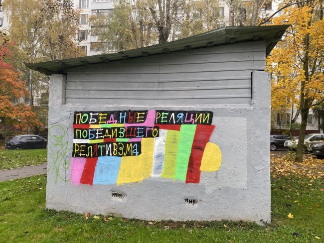 На трансформаторной будке рядом с корпусом 454 появилось красочное изображение с надписью: «Краски и времени, потраченных на эту работу, хватило бы на один потенциально коммерчески успешный холст». На боковой стороне сооружения — продолжение: «Победные реляции победившего релятивзма» (буквы «и» нет в оригинале).