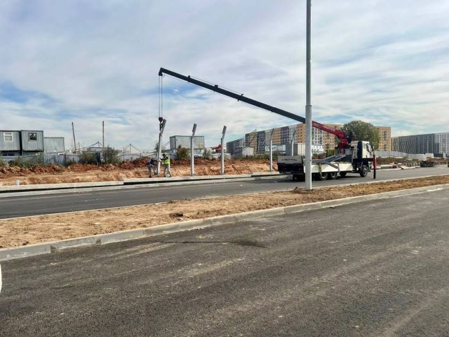 Сейчас строительная готовность объекта около 70%. Практически на всём участке завершены работы по устройству дренажных систем и подготовительных слоёв дорожного полотна, установлен бортовой камень, монтируют освещение.