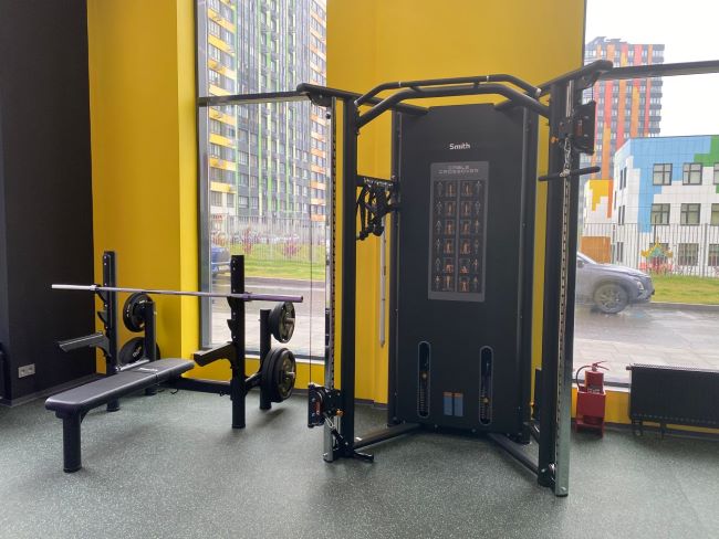 - на первом этаже — кардио-зона с беговыми дорожками, велотренажёрами, гребными машинами и эллипсоидами, а также зал силовых тренировок. Здесь же — мужская и женская раздевалки с душевыми.