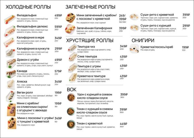 Сегодня в меню доступны только роллы и суши со скидкой 50% в честь открытия. Также в ассортименте: супы, салаты, поке, воки, комбо, горячие и холодные напитки. Меню с подробным прайсом — на фото, ассортимент напитков появится позже.